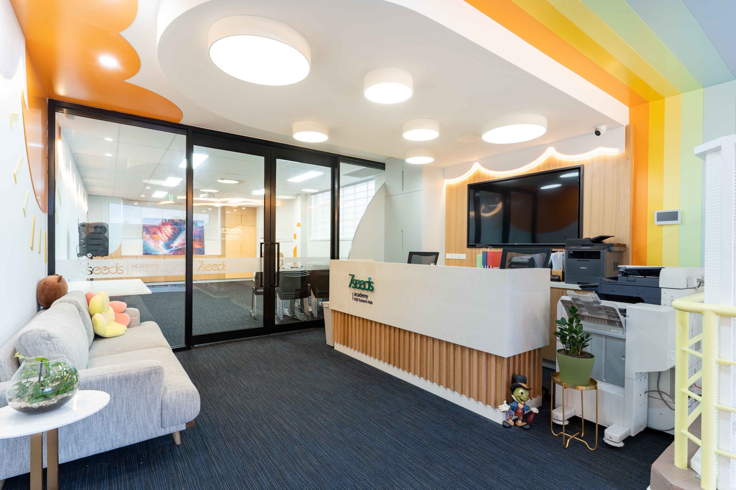 The client’s brief called for the conversion of a 300m² vacant tenancy into a kid-focused tuition center. Design concept inspiration from the business name, 7 Seeds, the design concept was developed around the idea of a rainbow, symbolizing growth, potential, and the journey toward success.