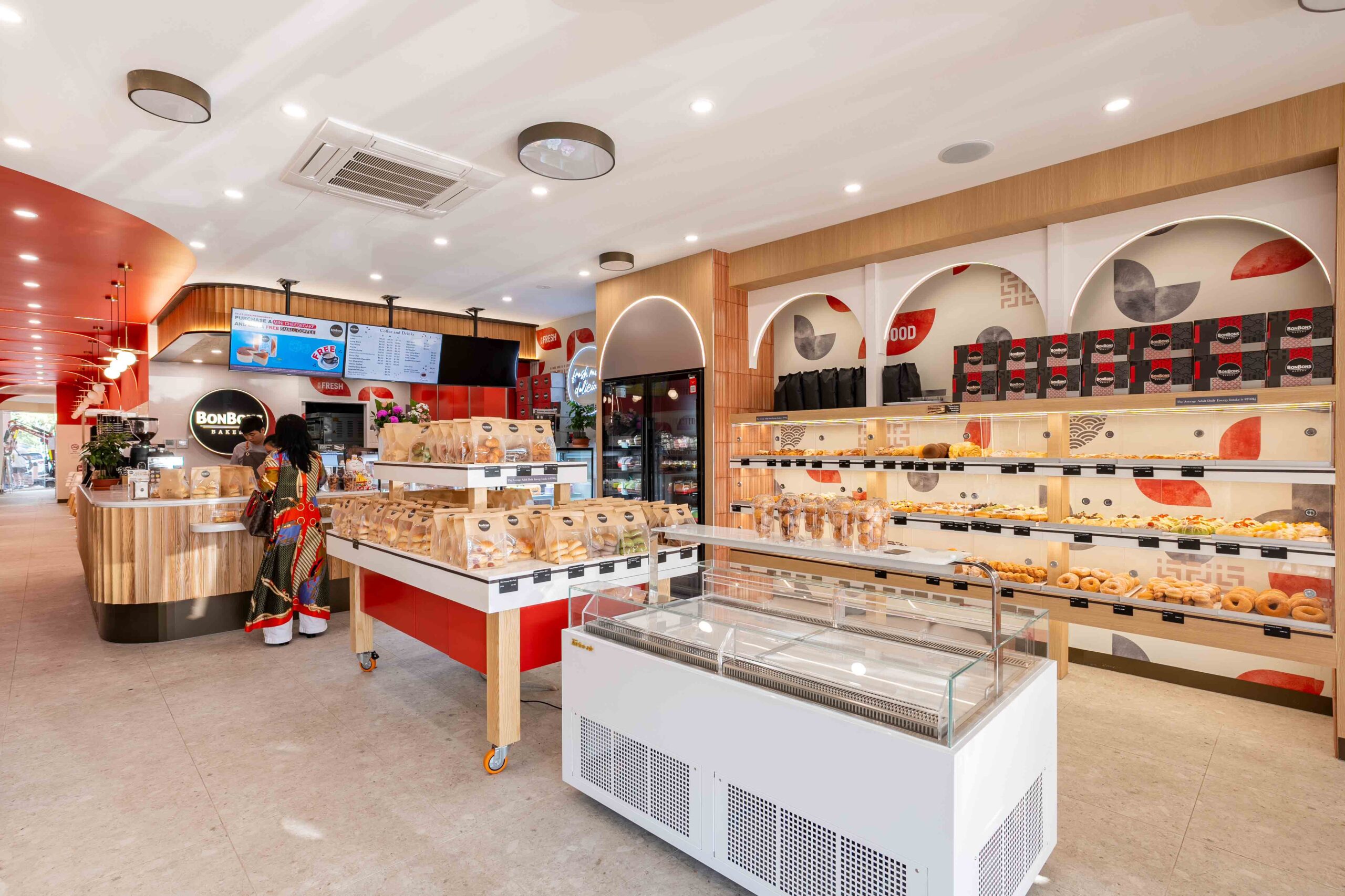 Guided by the brand concept “East Meets West,” the interior balances a warm timber palette with red and white accents to reflect brand identity while maintaining a calm, comfortable atmosphere. The overall intent is to create a welcoming and relaxed environment where customers can browse, select, and enjoy their preferred products with ease.