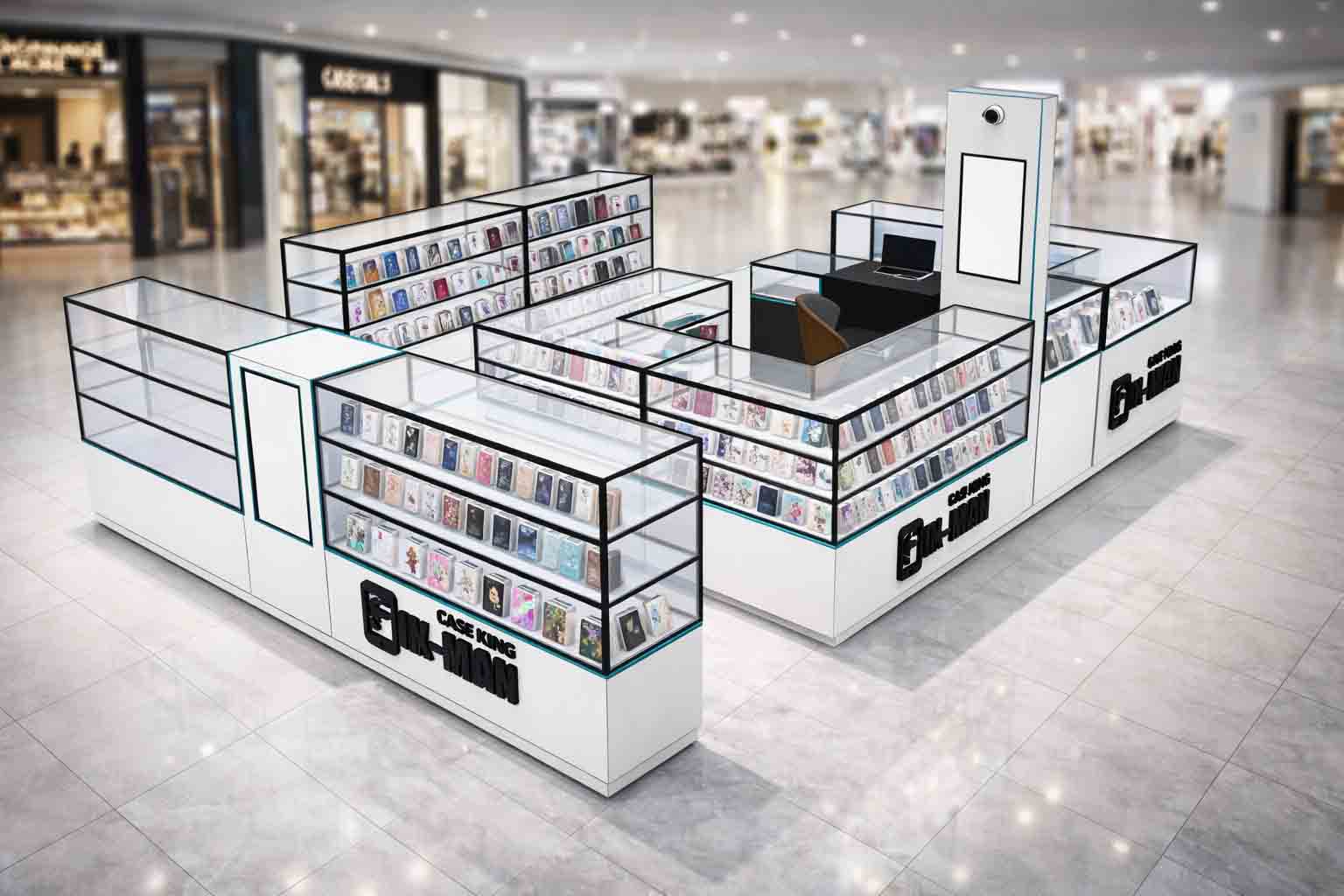 To elevate the overall look, the kiosk is designed with smooth, minimal lines and a clutter-free layout, with integrated storage to keep tools, cables, and stock out of sight. The result is a streamlined customer-facing counter that supports quick service, clear product presentation, and a polished brand image—without competing visually with the vibrant merchandise on display.