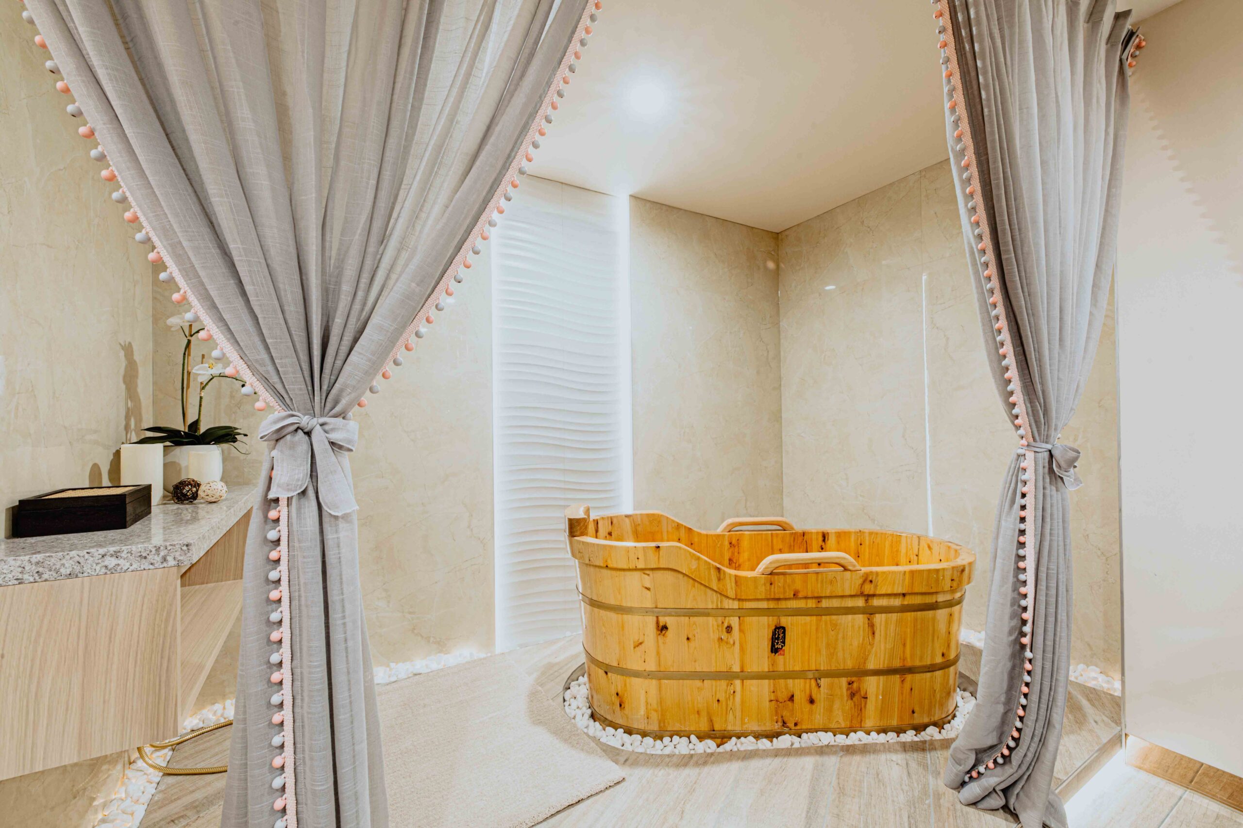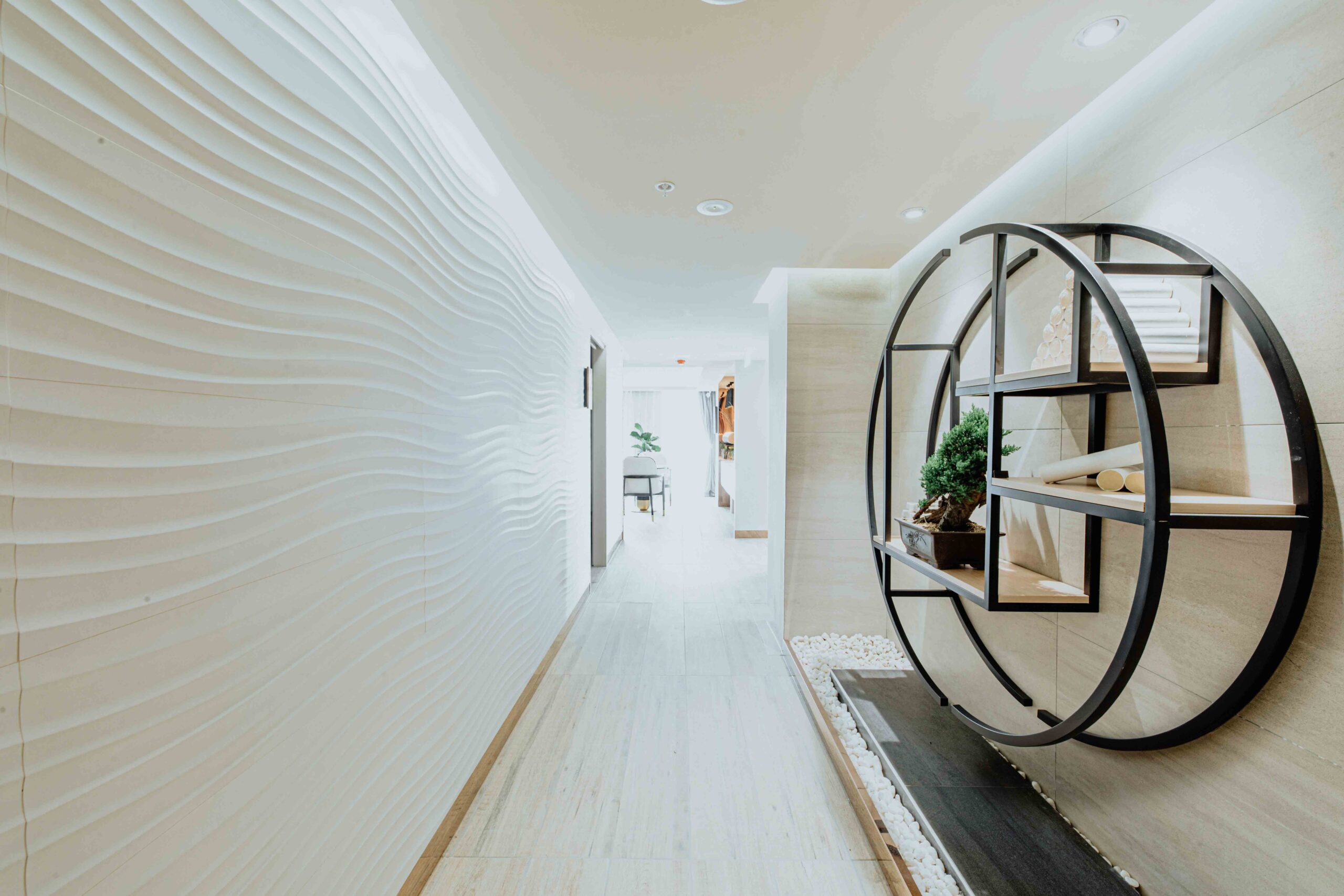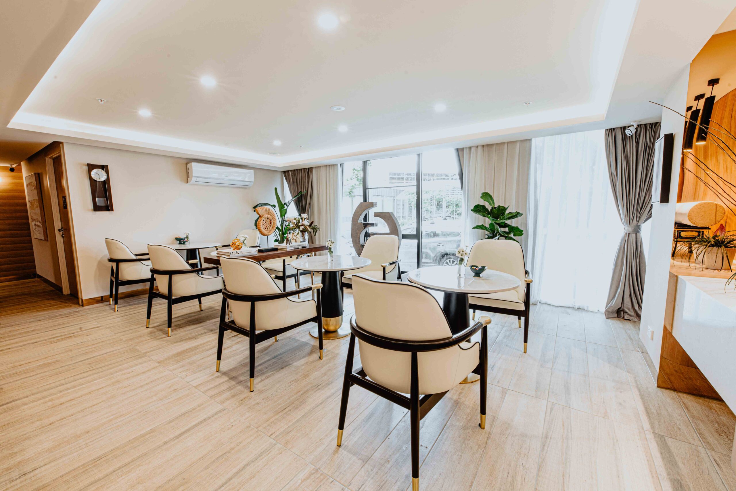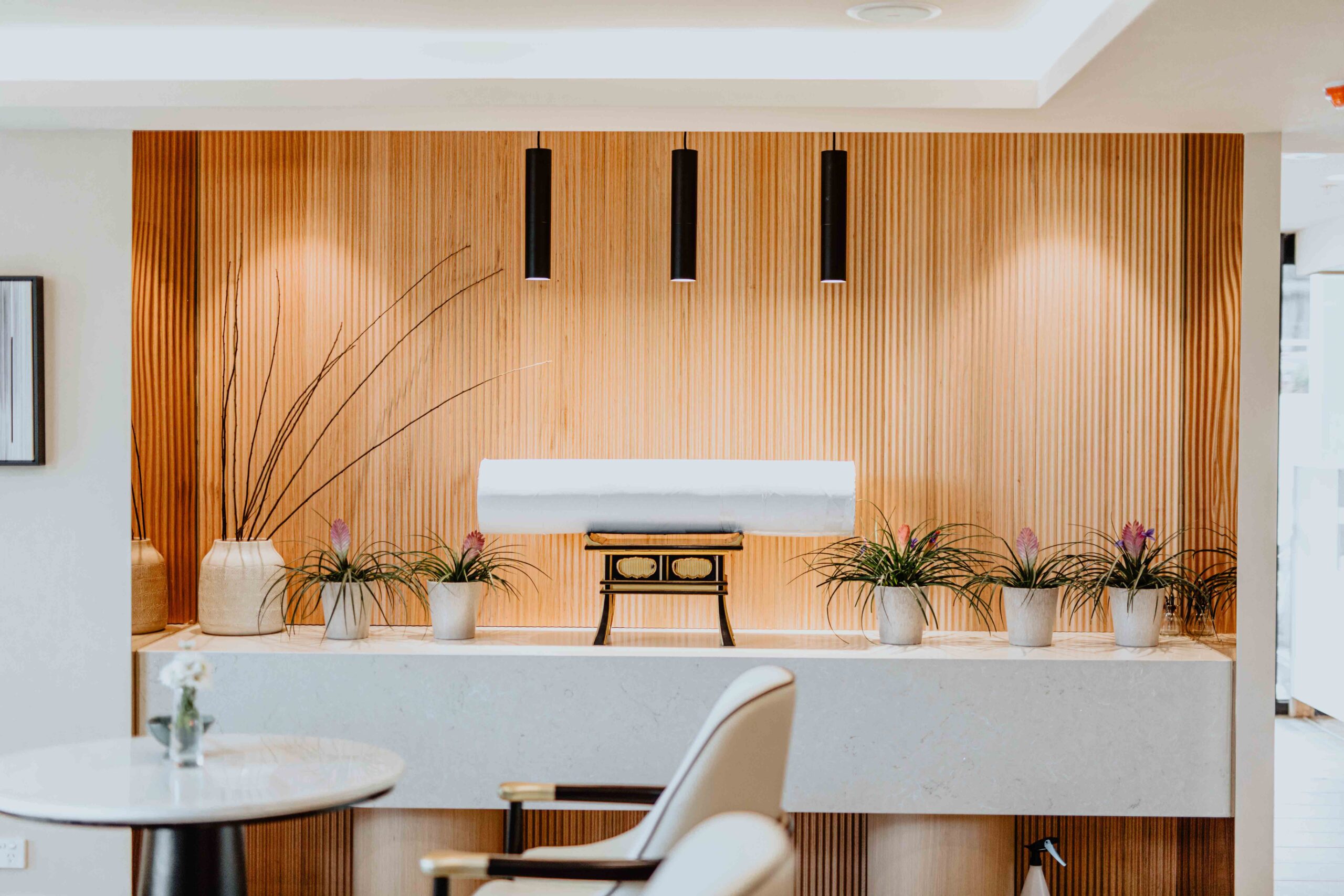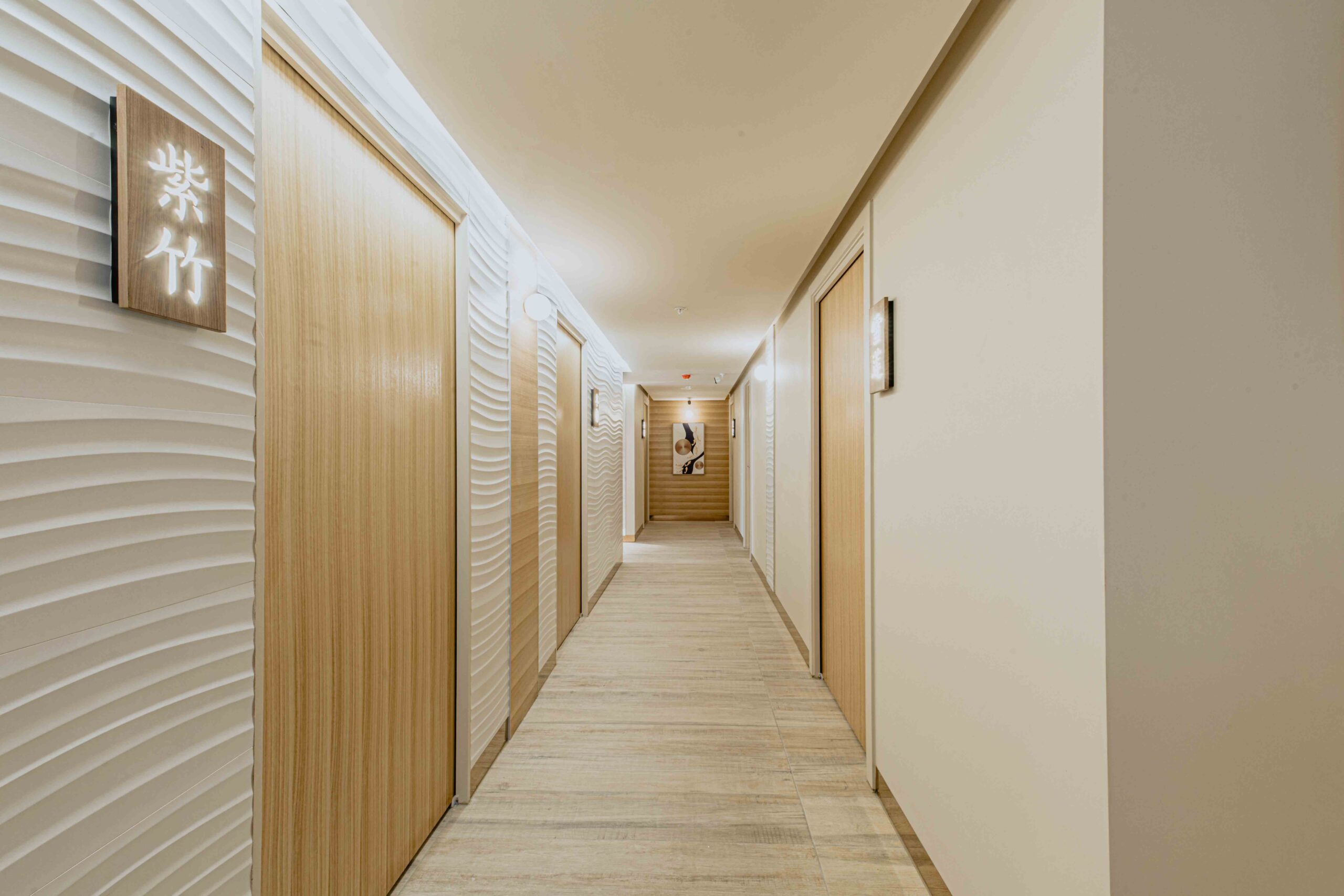 by combining the “ Hard” and “ soft” it allowed us to bring Harmony into space Such as The combination of the vertical timber slat wall and the curtain, the control of natural lights and the internal lighting design and etc