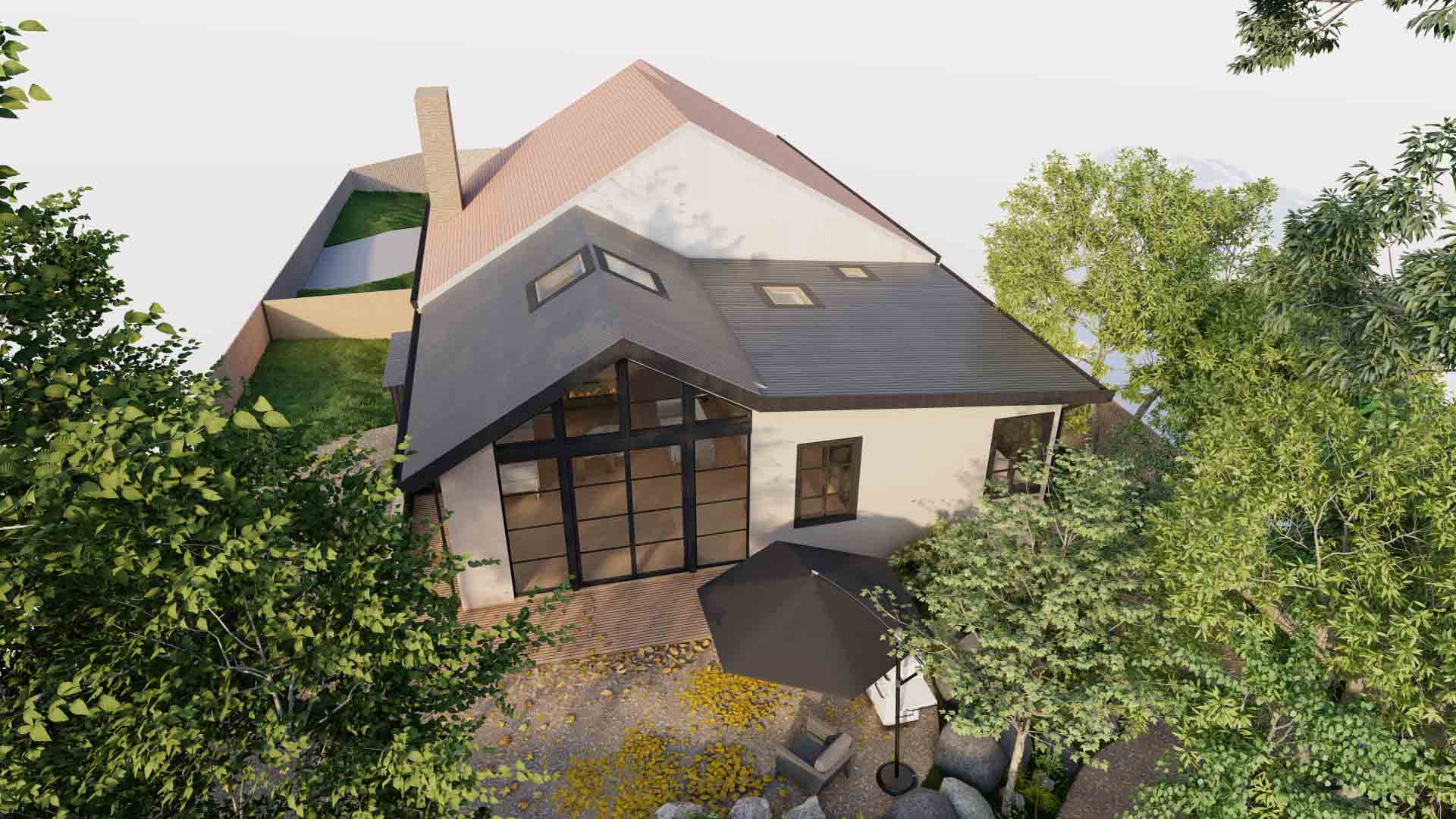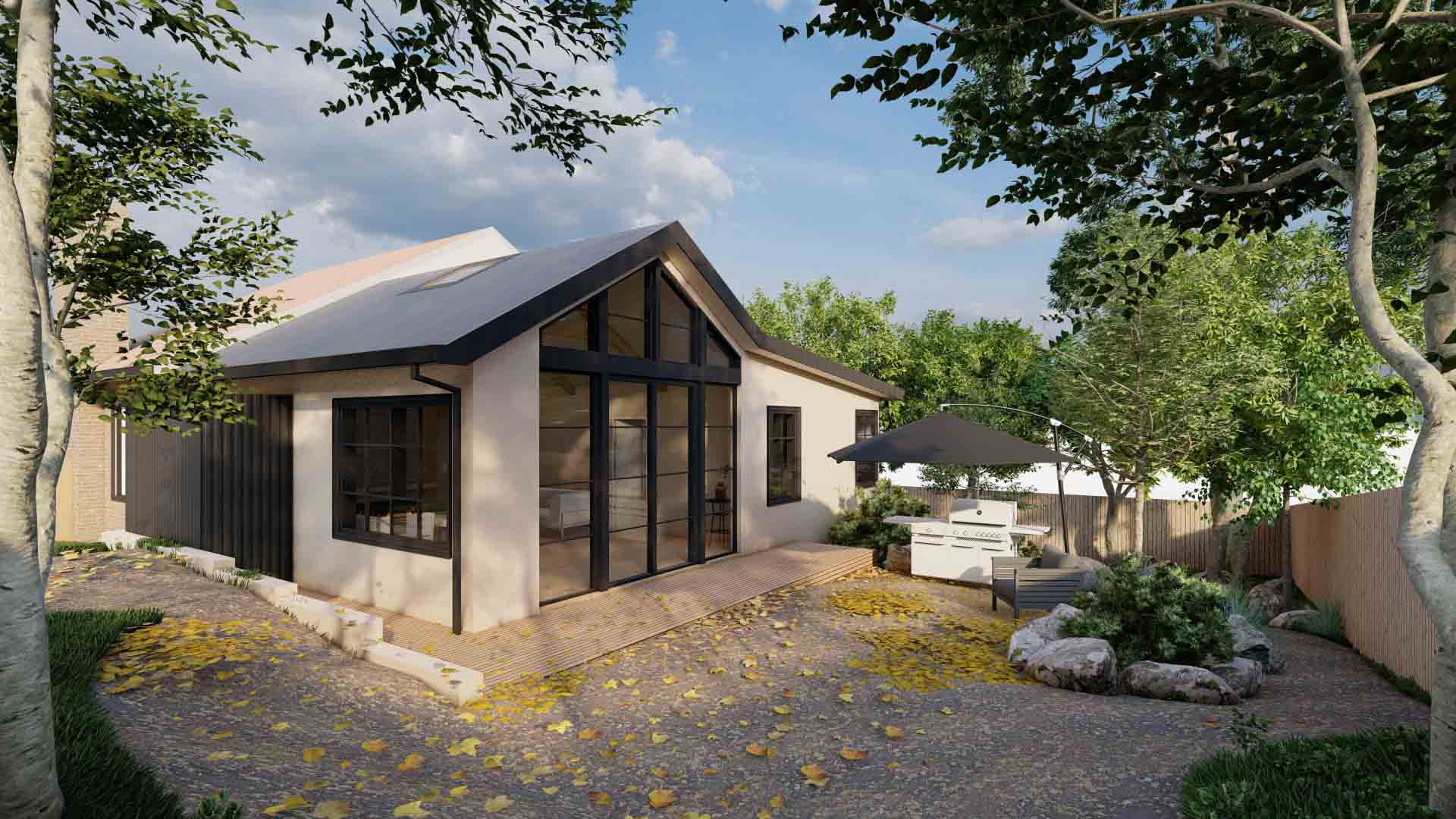 The living room is conceived as the key new volume, incorporating a cathedral-style window to frame views to the garden and strengthen the indoor–outdoor connection. A roof skylight is also integrated to introduce additional daylight, improving natural illumination and overall amenity within the home.