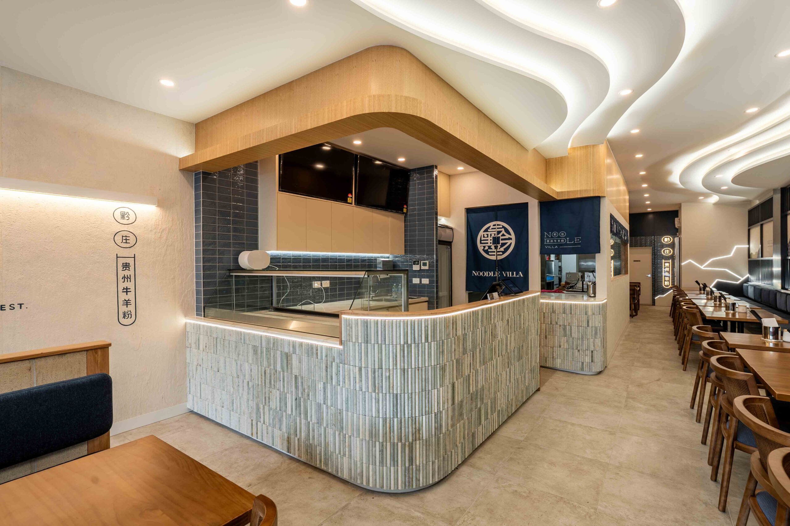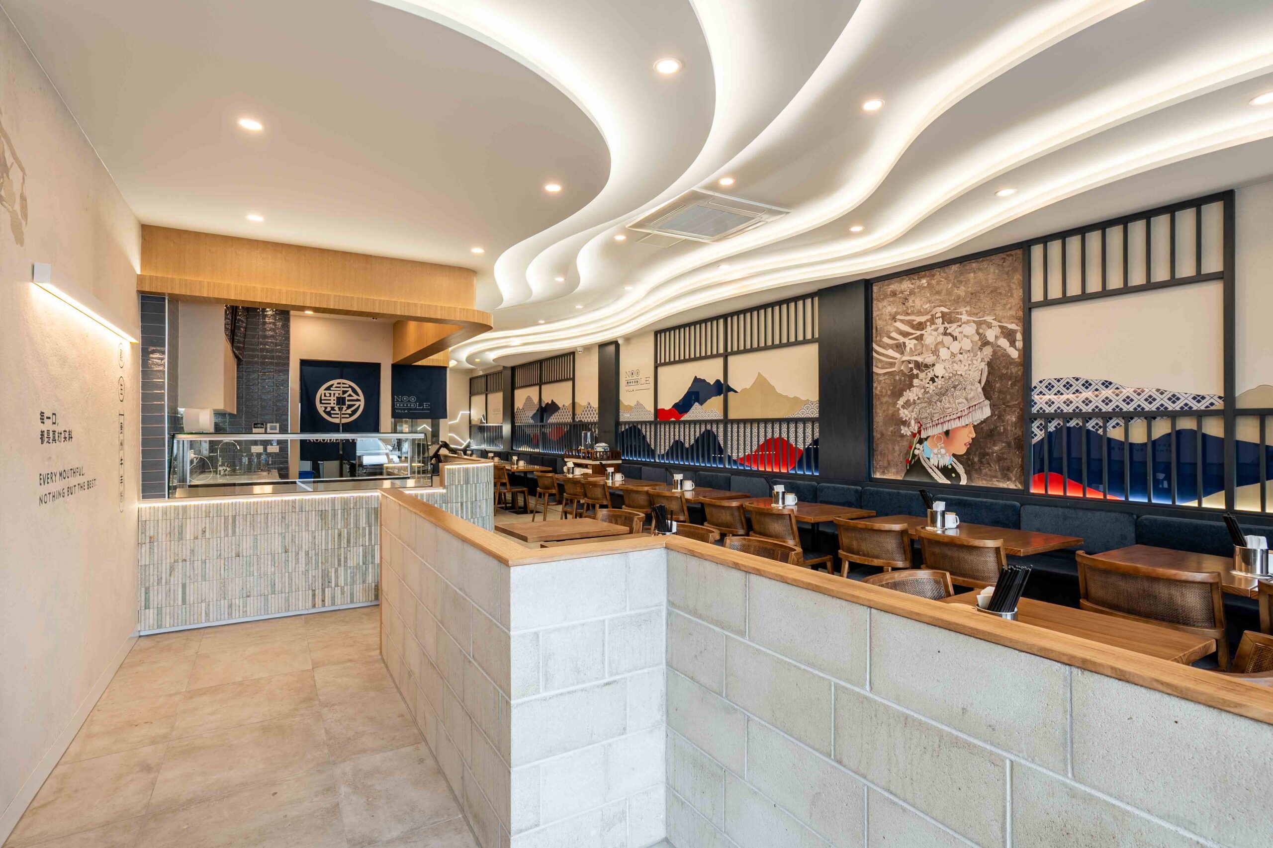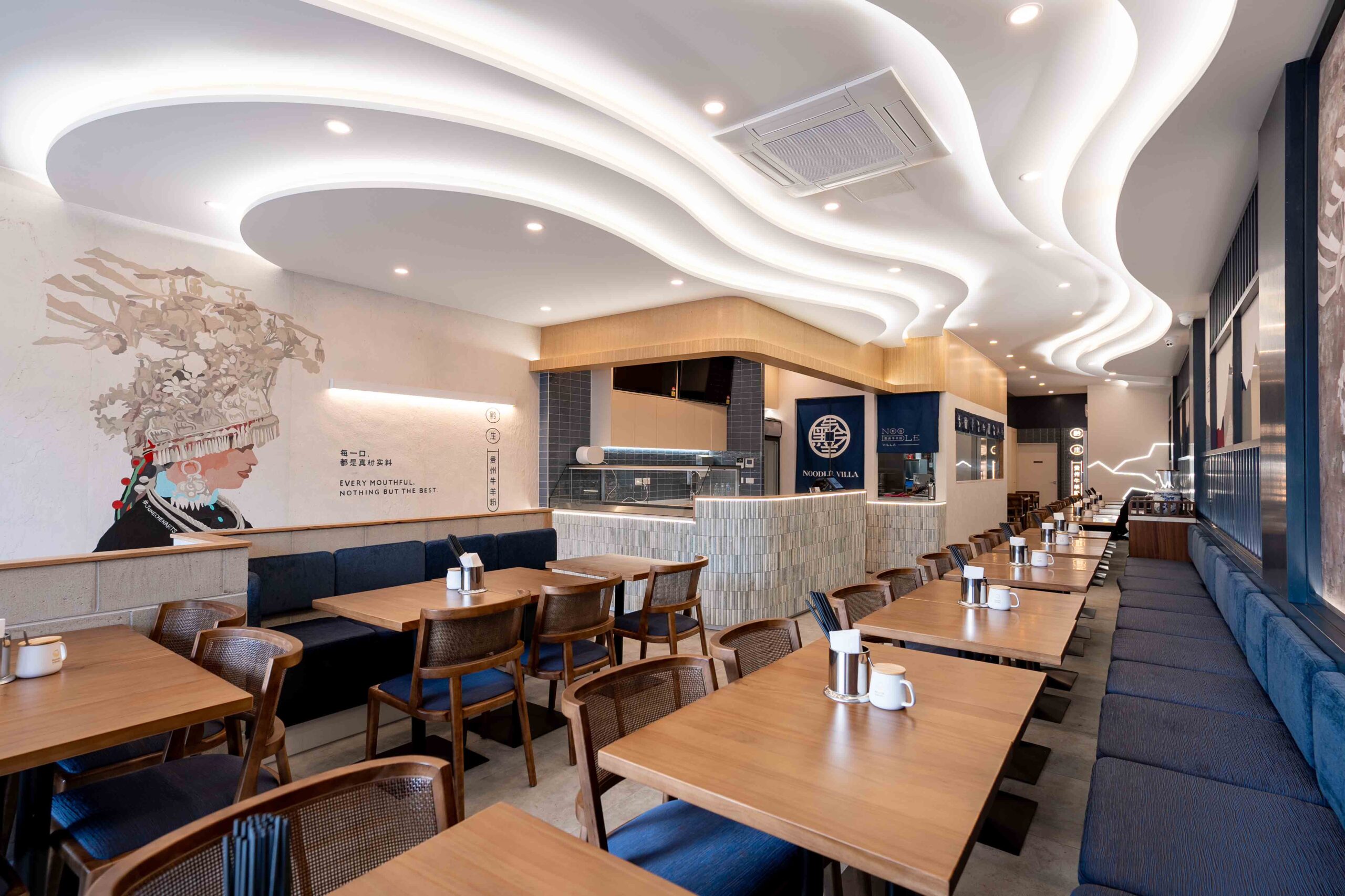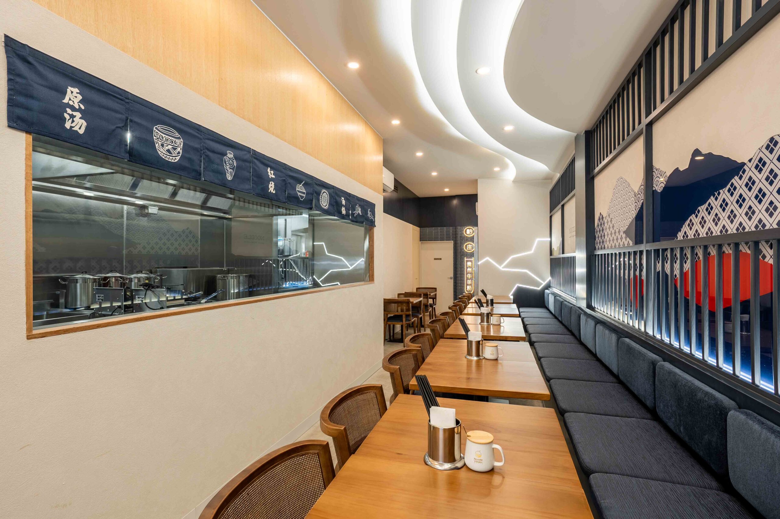 A key design highlight is the organic ceiling lighting feature, inspired by the flowing movement of noodle-making. This sculptural lighting design not only creates a striking focal point but also immerses diners in a subtle narrative that connects tradition with modernity.