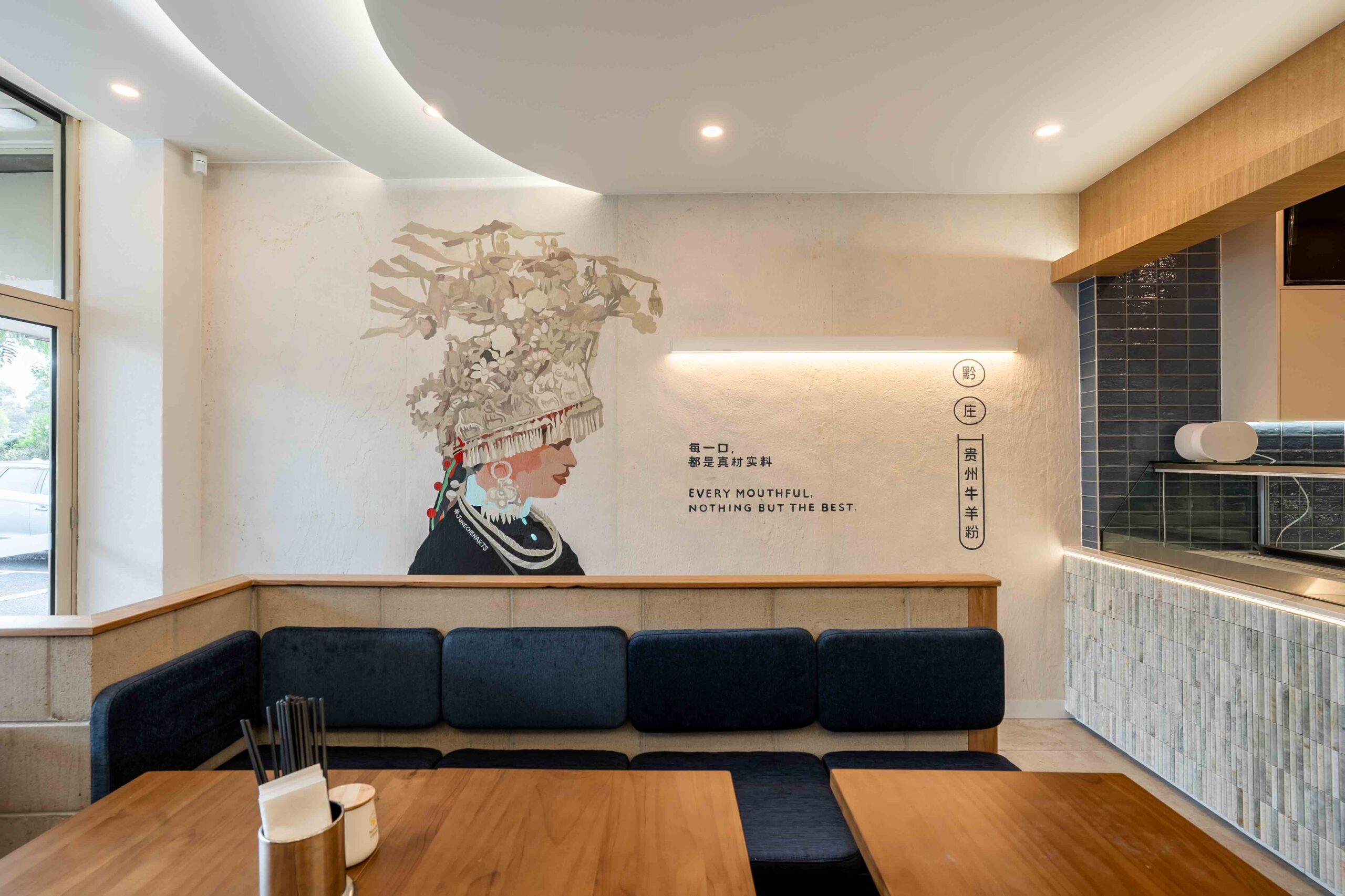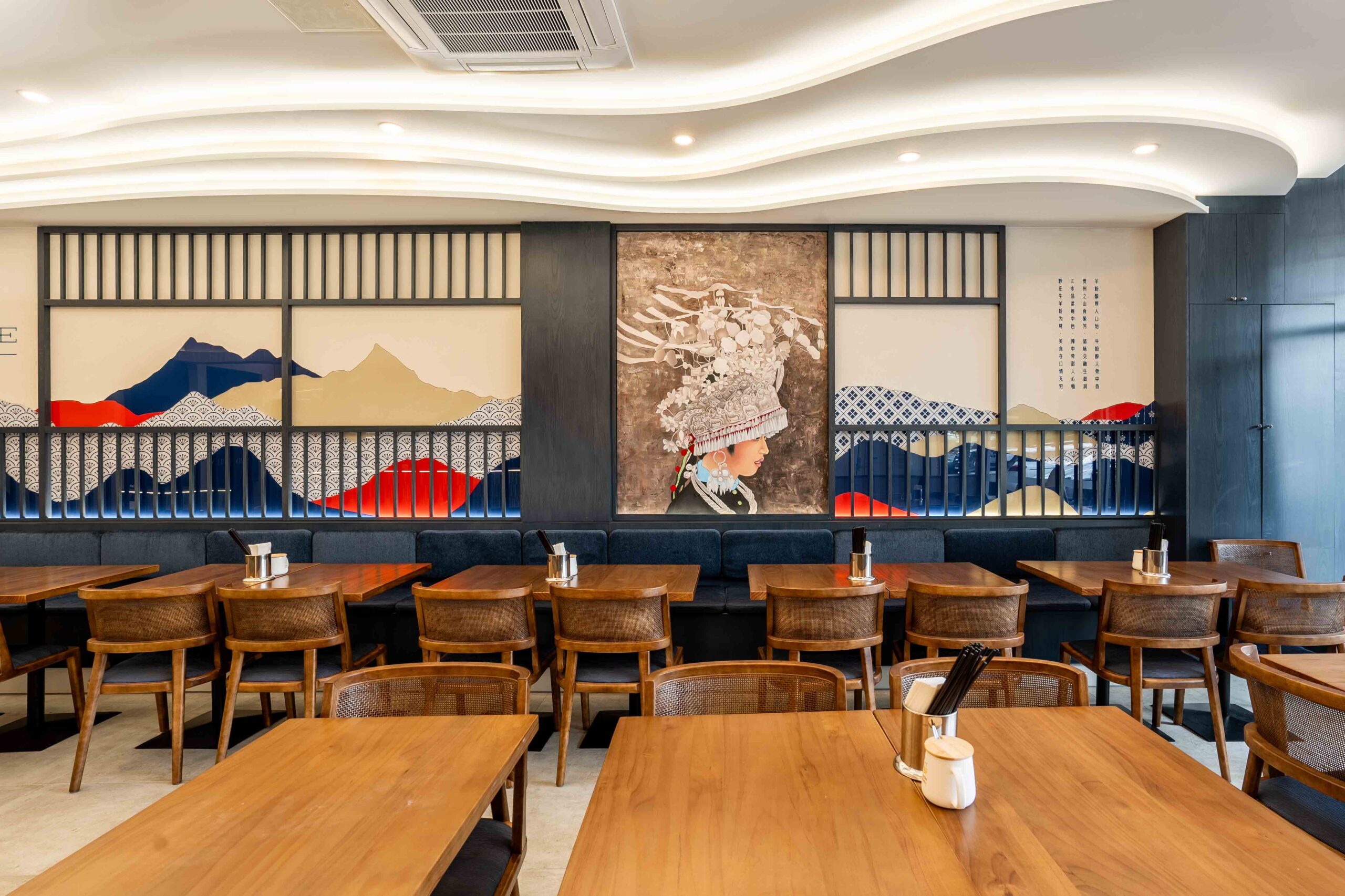 s2dio-X has been engaged to design a modern Guizhou Beef and Lamb Noodle Shop in Doncaster East. The design vision is to enhance the dining environment with strong cultural identity, celebrating the uniqueness of the Guizhou people while respectfully incorporating elements of their traditional attire and color palette.