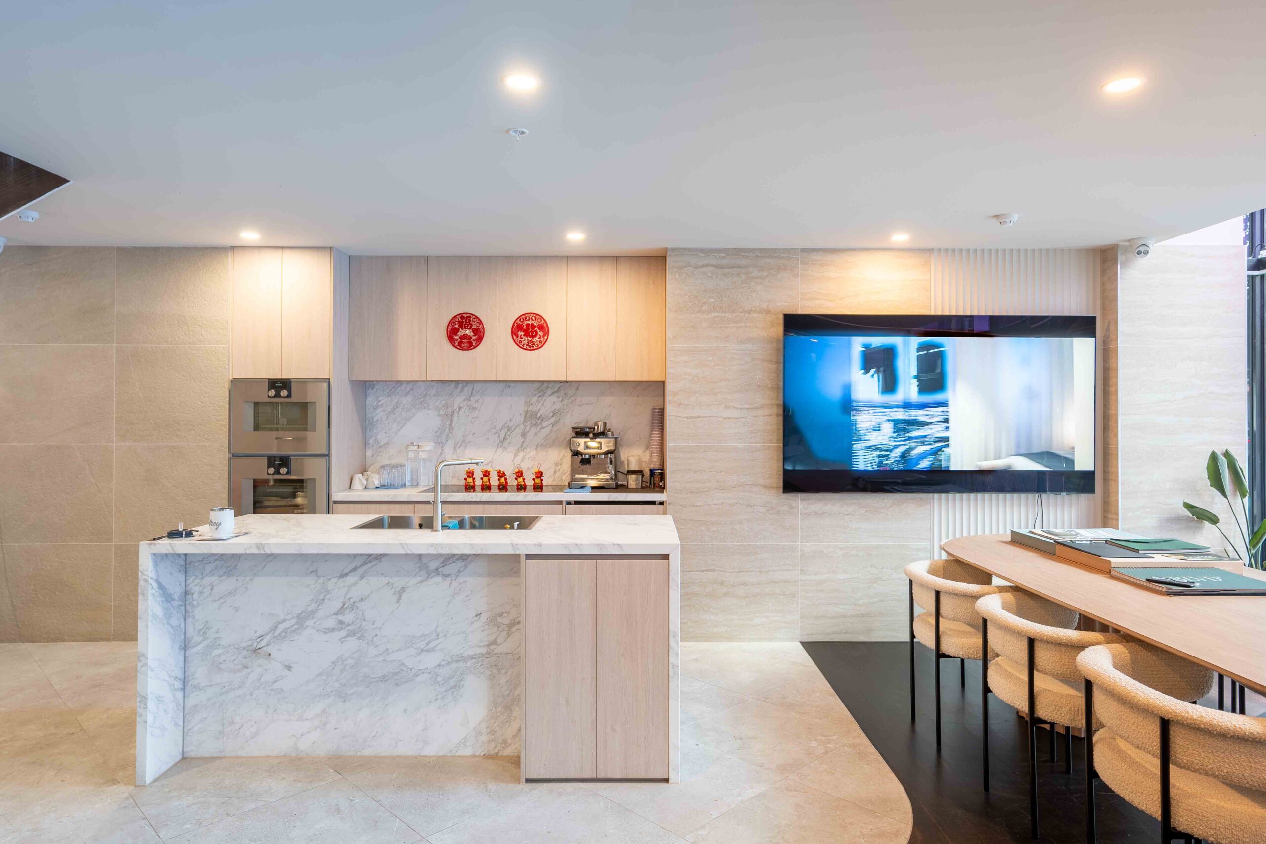 The ground floor is planned as a public-facing display environment, incorporating two model display zones and a full-scale kitchen display. The mezzanine level accommodates the operational workplace, including two director offices and an open-plan workstation area.