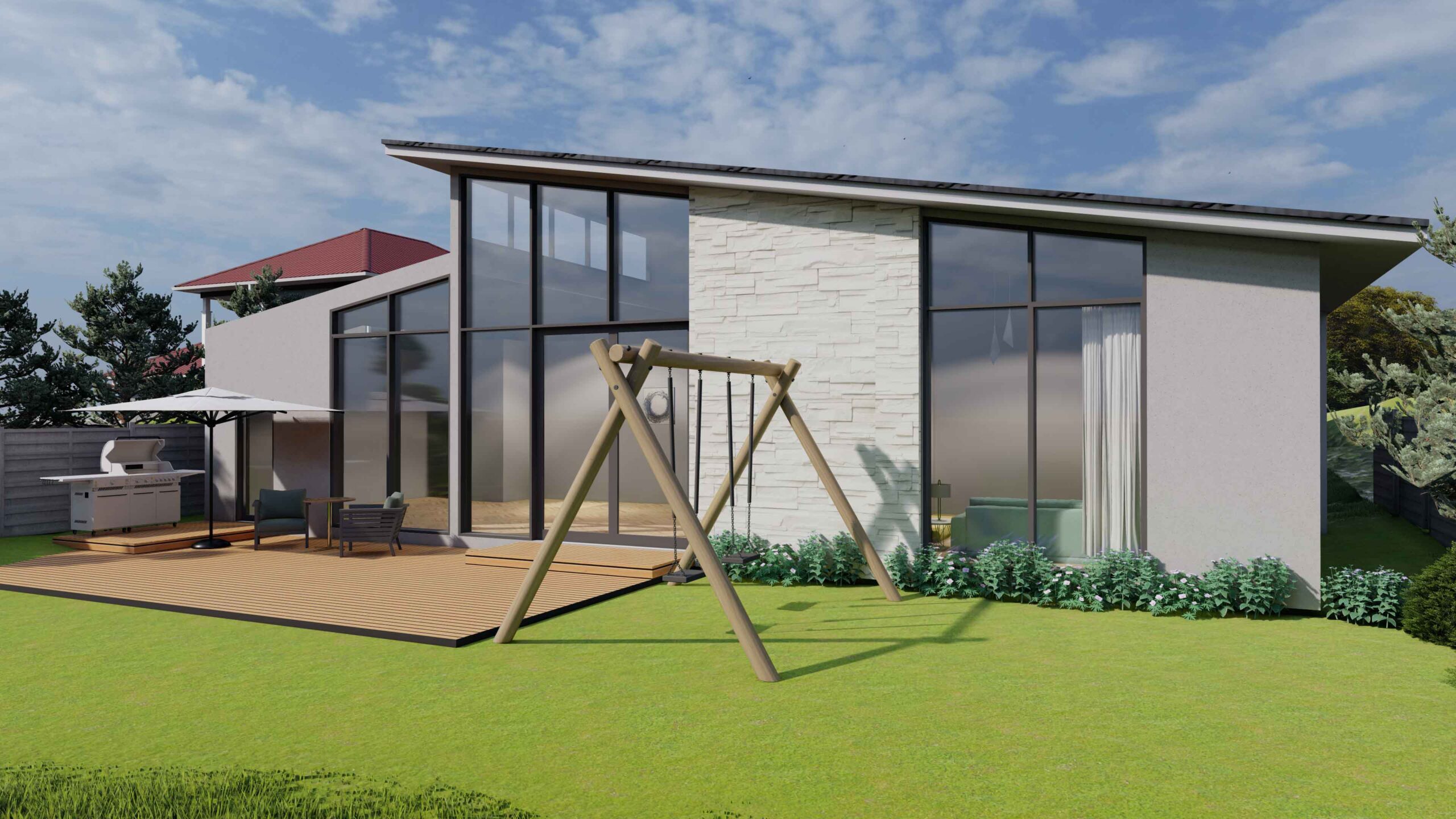 To capitalize on the Northern exposure, the living and dining area features an angled roof design that optimizes the penetration of natural light. Moreover, the full-height windows on the rear elevation foster a seamless connection between the interior and the private garden. These design interventions aim to create a relaxed and inviting environment that caters to the needs of the family.